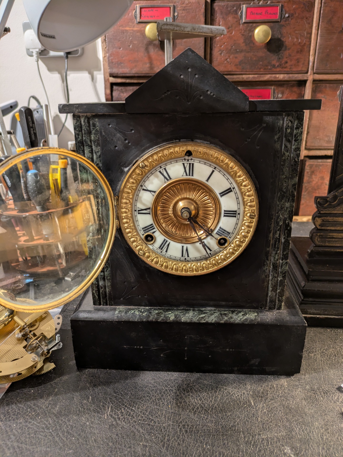1880 French mantel clock, clean and repair both springs and movement, repainted and restored outer case